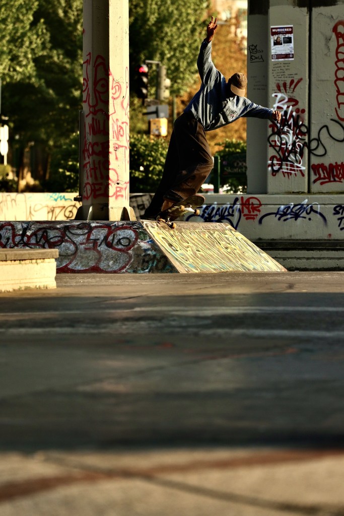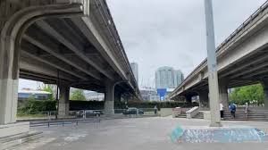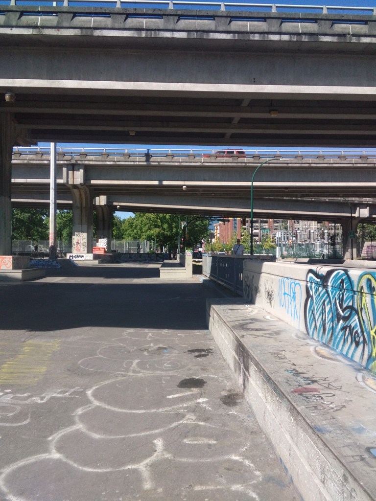 The Georgia and Dunsmuir viaducts keep skaters in the shade on blazing hot days and provide shelter ( to a certain extent) during rainy ones (which are plentiful in The Pacific Northwest )